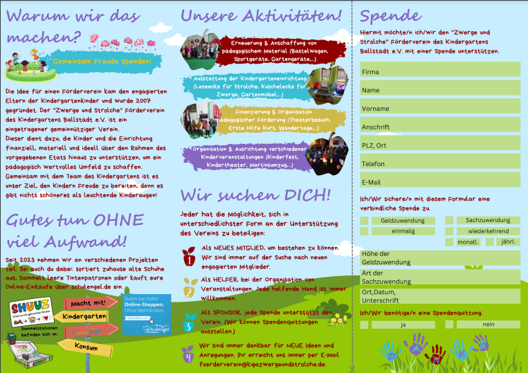 Ladet euch unseren Flyer bzw. Anmeldung gleich hier herunter und füllt das Formular aus. Dieses könnt ihr uns als E-Mail zurücksenden oder werft es in unseren Briefkasten im Kindergarten ein. Vielen Dank für Deine/ Eure Unterstützung. Ihr helft uns dabei, den Kindern eine Freude zu machen!